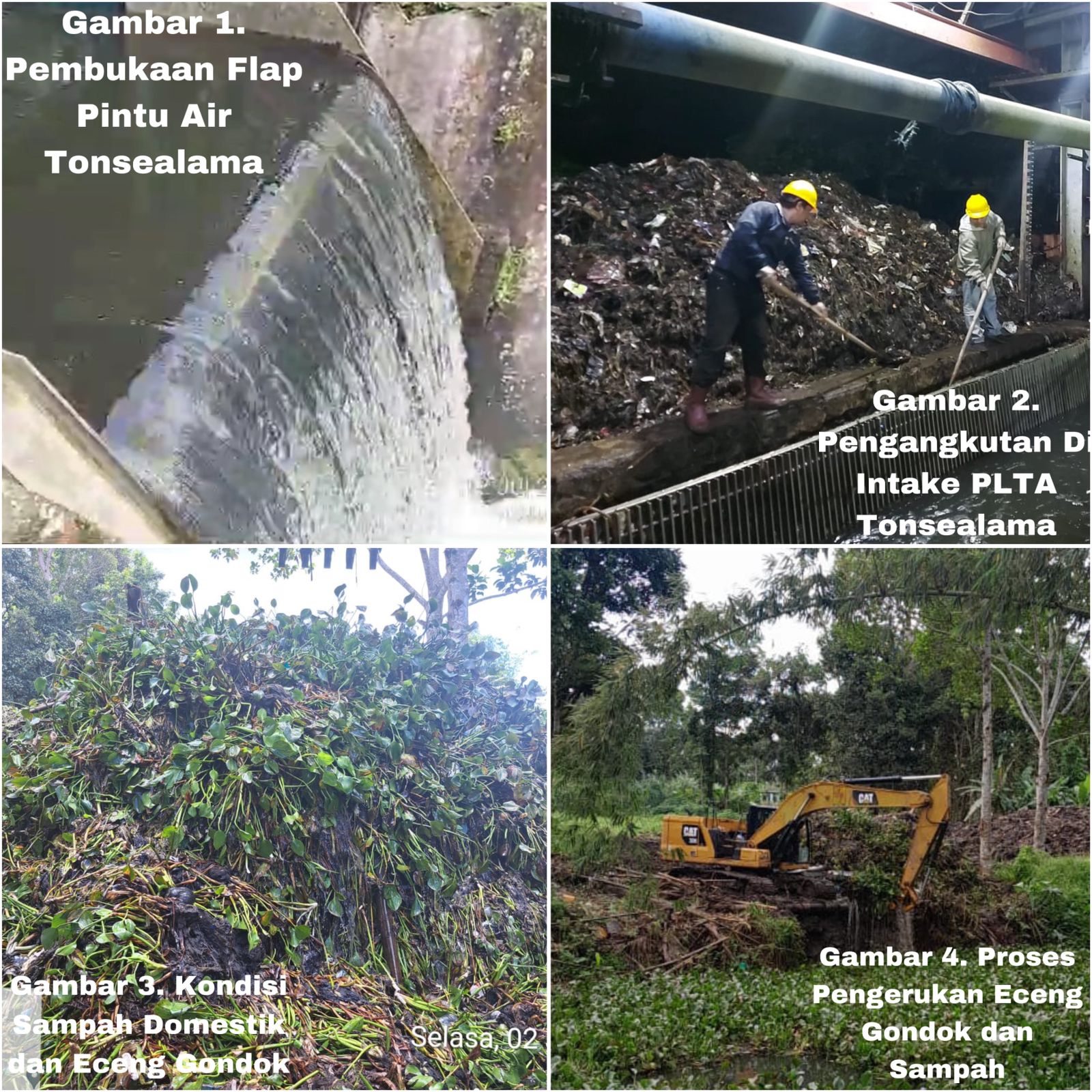sampah yang masuk di area weir intake meningkat drastis di musim penghujan sehingga untuk pembebanan maksimal saringan halus harus selalu dalam keadaan bersih sebelum masuk ke turbin mesin. Dengan menambah tenaga pembersihan nonstop 24 jam, Perubahan Mekanisme pembersihan area KPS dan Intake pihak UP Minahasa dan ULPLTA Tonsealama melakukan Perubahan serta penyesuaian kembali Mekanisme Pembersihan KPS. Hal ini dimaksudkan agar memaksimalkan pekerjaan pembersihan agar sampah eceng gondok tidak menumpuk yang dapat menyebabkan penurunan debit elevasi air, Dimana pihak ketiga ini menambah pos pengangkatan eceng gondok menjadi 3 titik. titik pengangkutan yaitu pada Kolam penampung sampah, Weir intake dan area sekitar wilayah desa Kembuan dan Tonselama